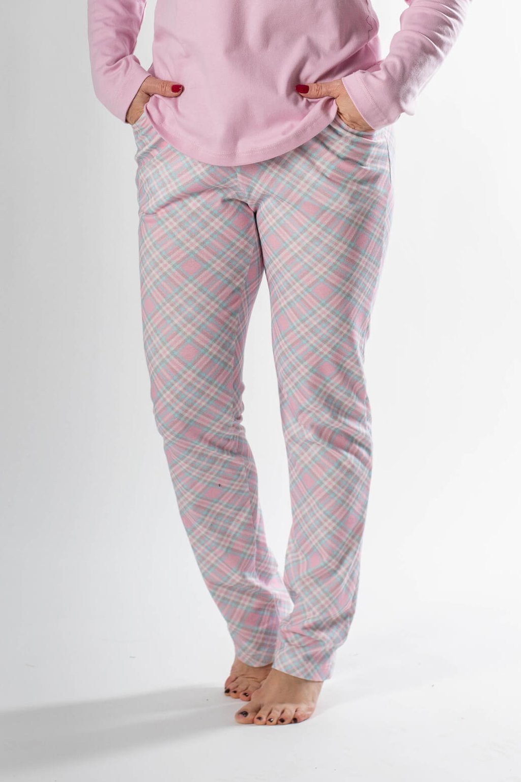Objavte naše dámske pyžamo MIYA s dlhým rukávom – kúsok, ktorý spája komfort a jemnú eleganciu. Toto pohodlné pyžamo v atraktívnej farebnej kombinácii ružovej a kára je ideálne na každodenný relax. Komplet sa skladá z ružového trička s dlhým rukávom, ktoré je zdobené elegantnou potlačou mašle pri výstrihu, a dlhých nohavíc v károvanej potlači. Nohavice majú voľný strih a elastický pás pre dokonalé padnutie. Prioritou je maximálny komfort a kvalita. Celé dámske pyžamo je vyrobené: tričko 50% bavlna a 50% modal, nohavice sú zo 100% bavlny, čo zaručuje priedušnosť, jemnosť a šetrnosť k pokožke. Bavlnené pyžamo MIYA vám poskytne teplo a pohodlie pre pokojný spánok aj relaxáciu v domácom prostredí.