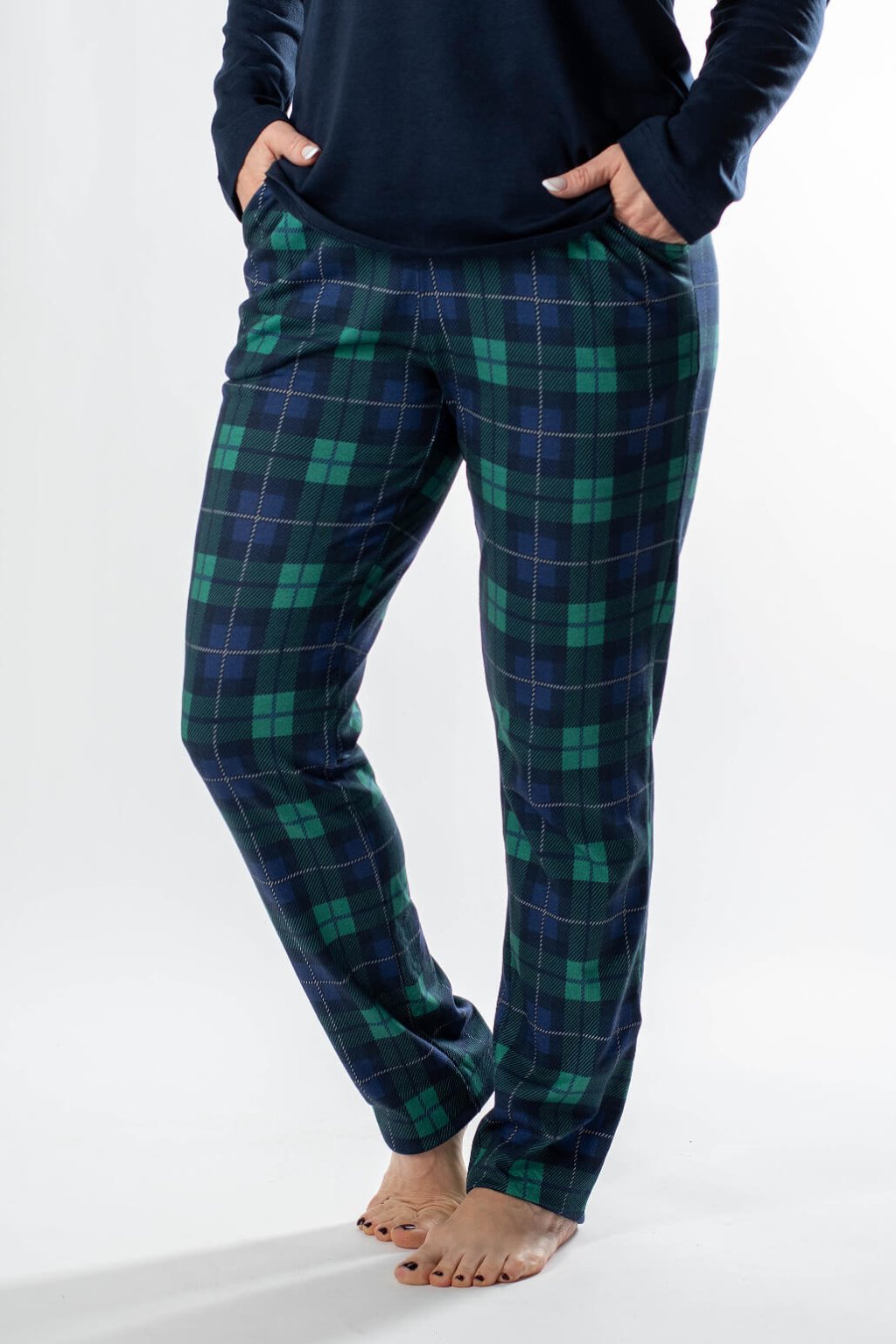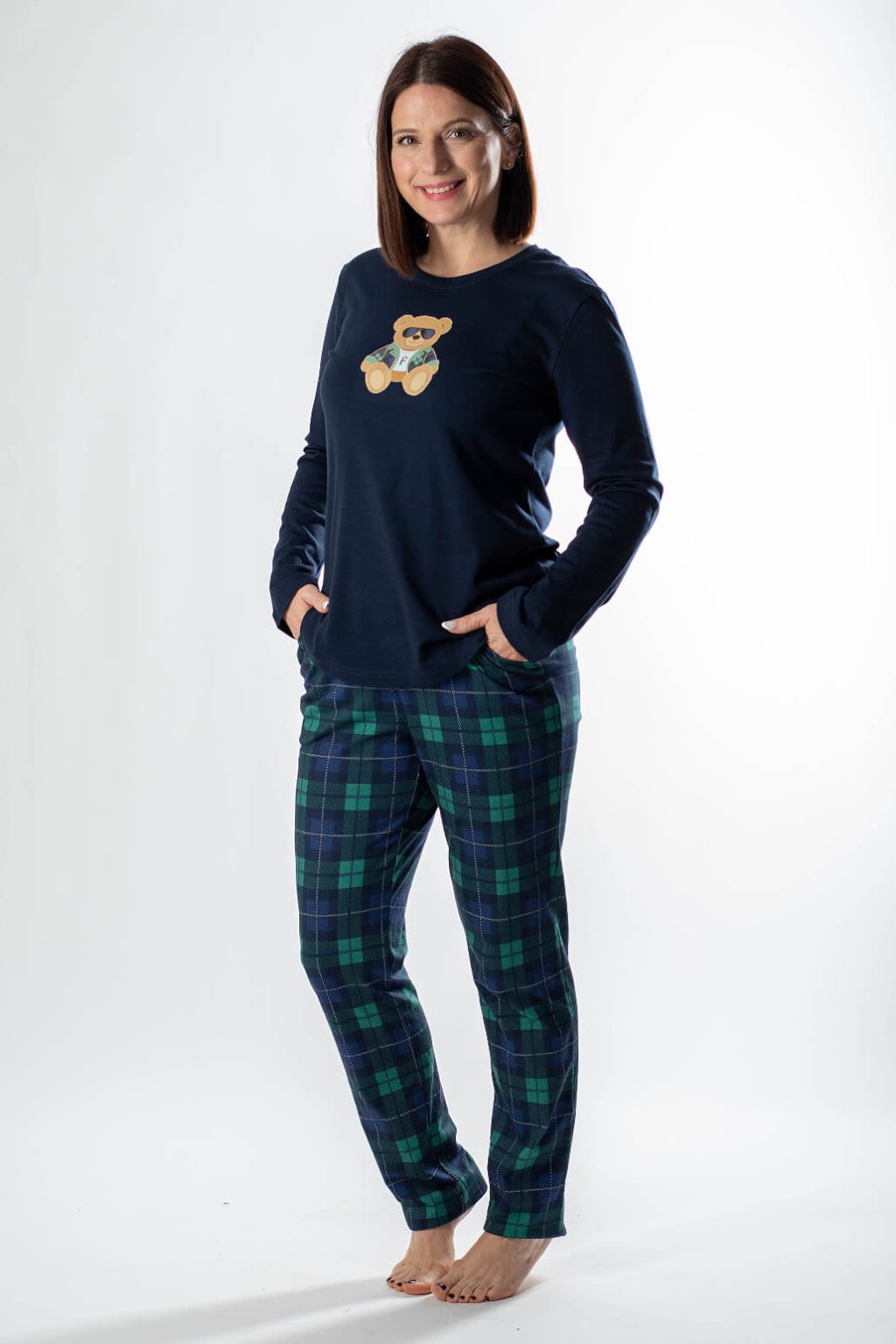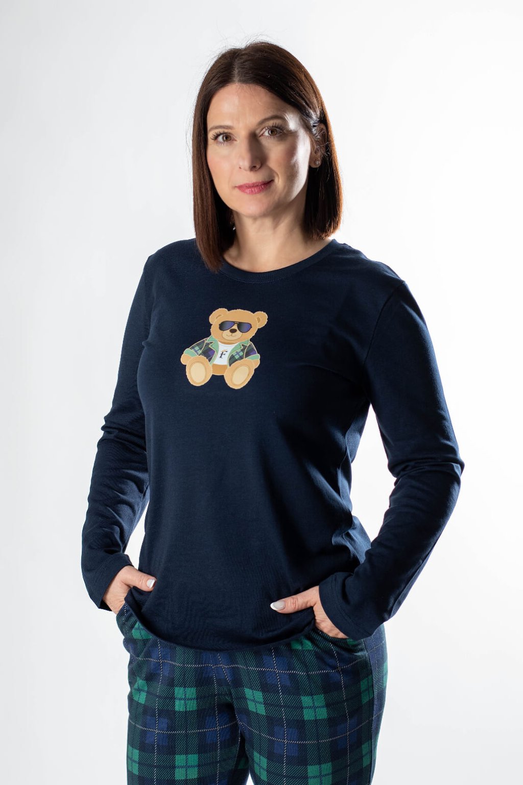 Objavte naše dámske pyžamo MIYA s dlhým rukávom – kúsok, ktorý spája komfort a jemnú eleganciu. Toto pohodlné pyžamo v tmavšej farebnej kombinácii a kára je ideálne na každodenný relax. Komplet sa skladá z  trička s dlhým rukávom, ktoré je zdobené potlačou medveďa pri výstrihu, a dlhých nohavíc v károvanej potlači. Nohavice majú voľný strih a elastický pás pre dokonalé padnutie. Prioritou je maximálny komfort a kvalita. Celé dámske pyžamo je vyrobené: tričko 50% bavlna a 50% modal, nohavice sú zo 100% bavlny, čo zaručuje priedušnosť, jemnosť a šetrnosť k pokožke. Bavlnené pyžamo MIYA vám poskytne teplo a pohodlie pre pokojný spánok aj relaxáciu v domácom prostredí.