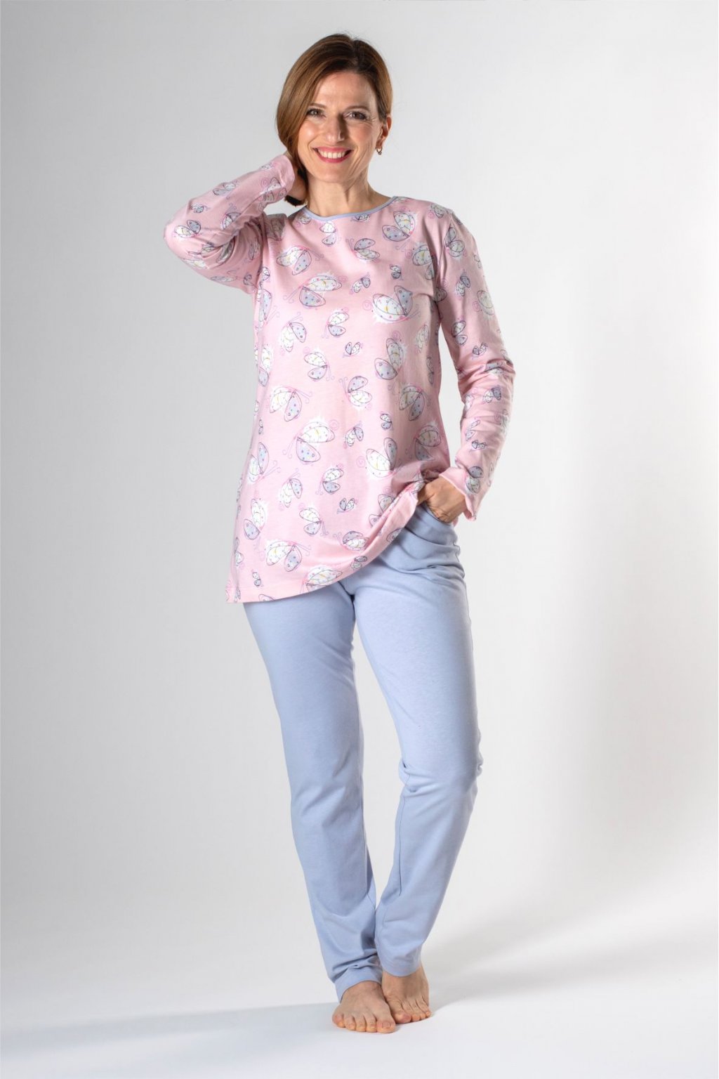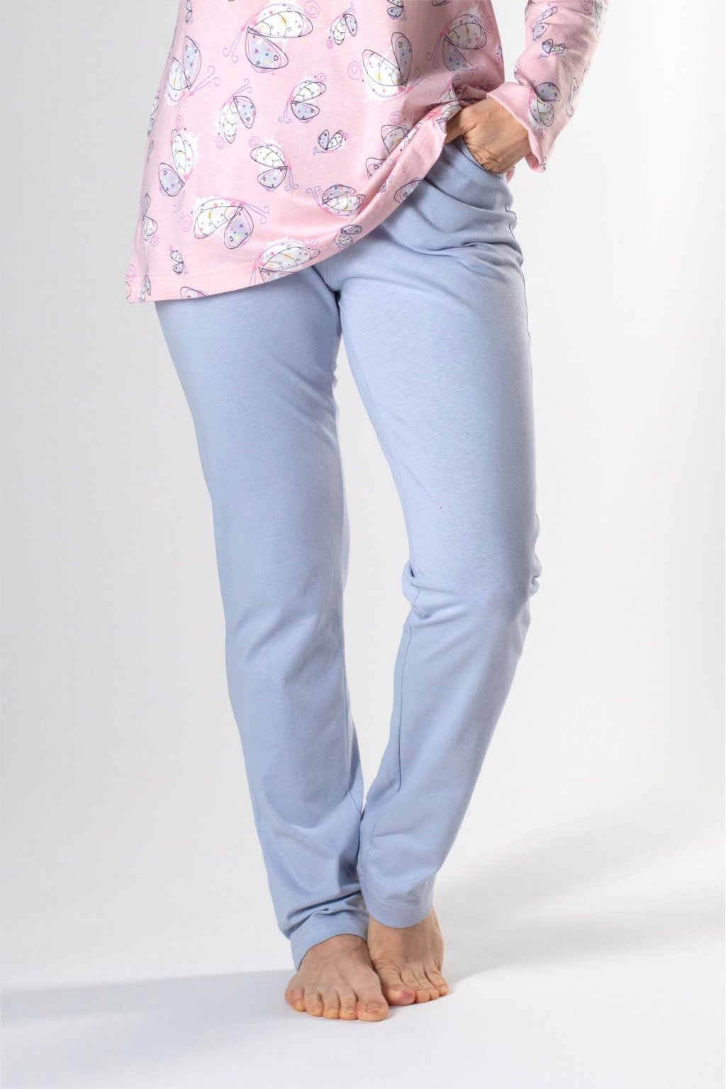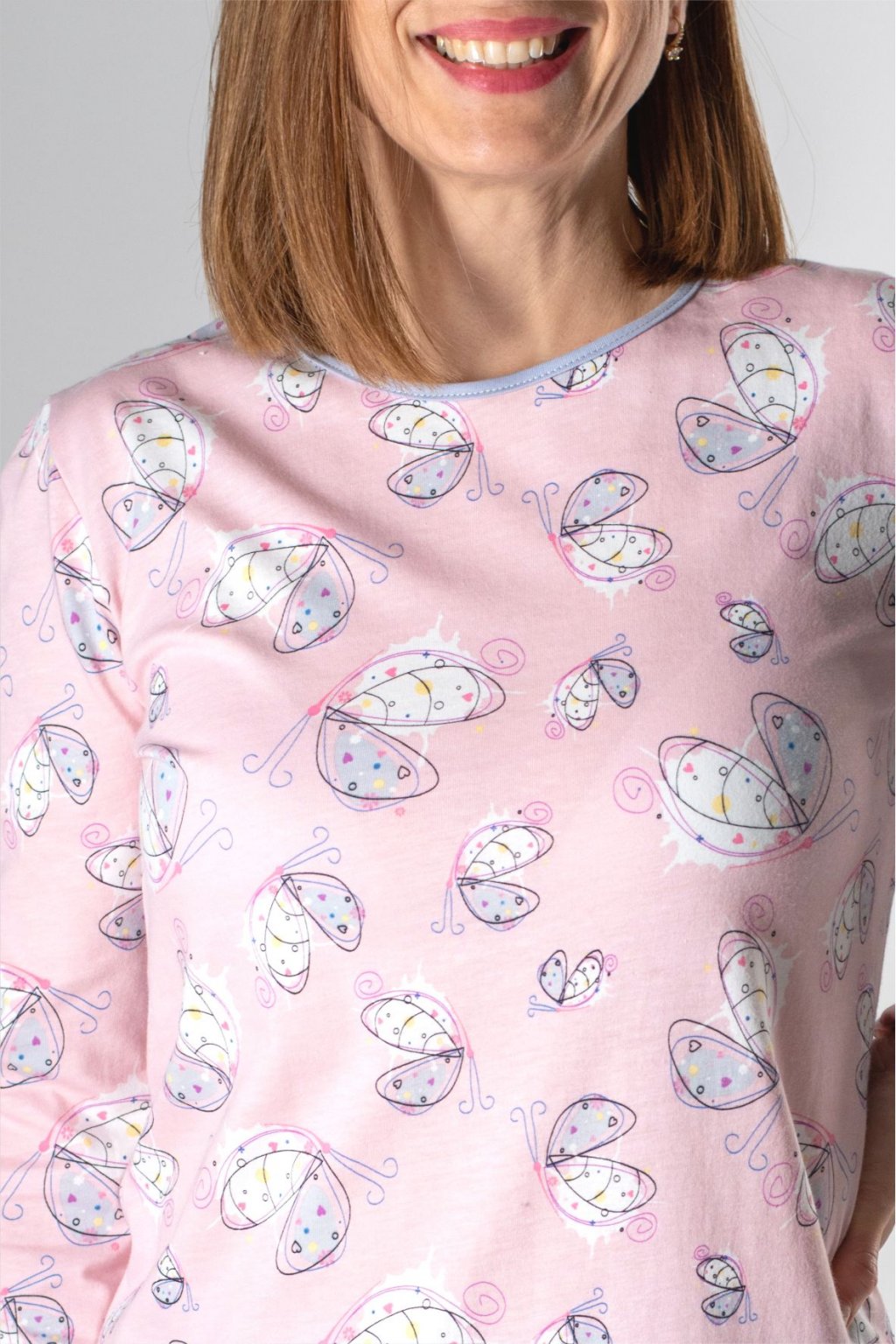 Dámske pyžamo pohodlného strihu. Tričko pyžama v má dlhý rukáv a jemnú potlač motýľov.