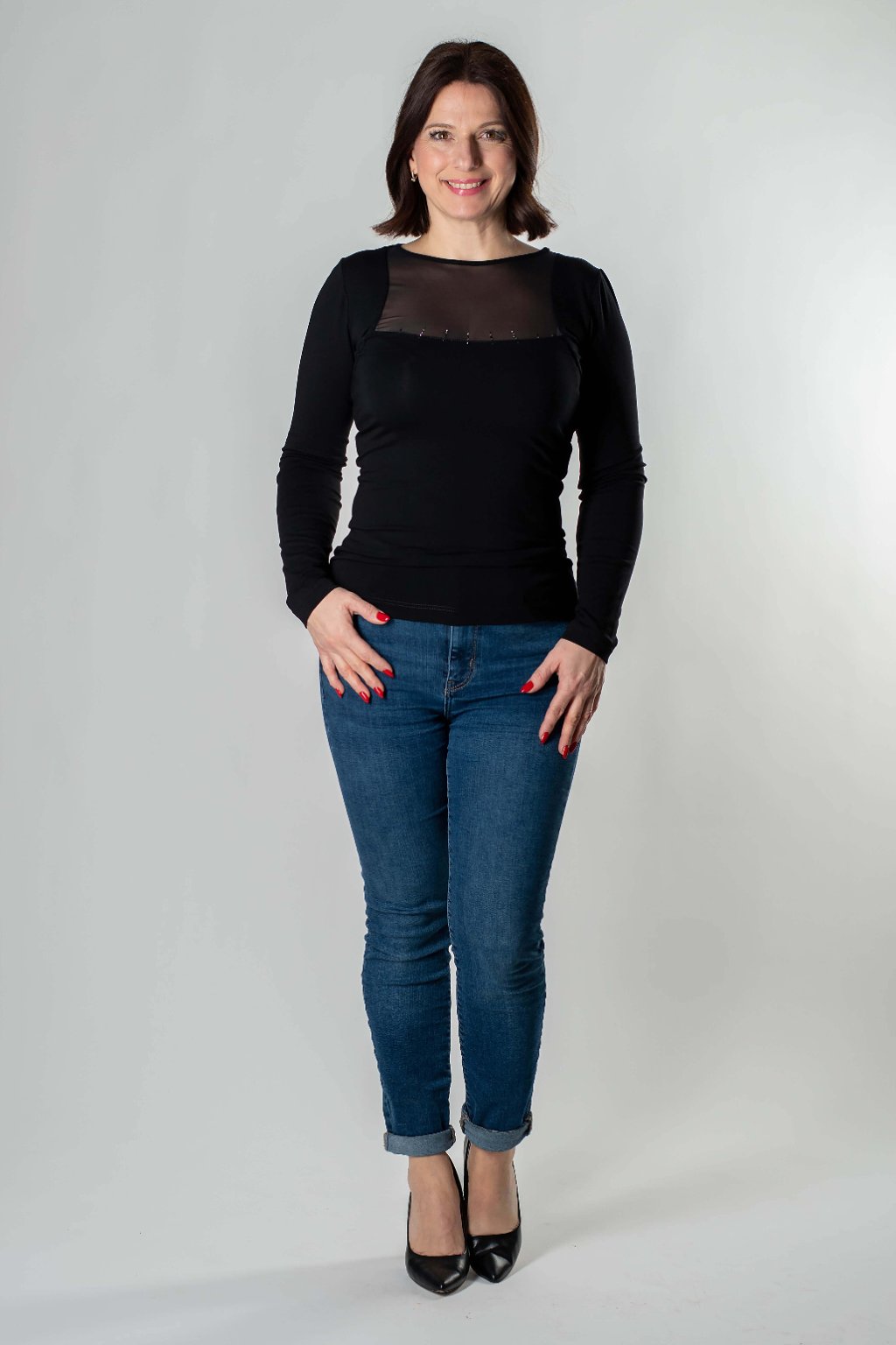 Základný kúsok do vášho šatníka, obzvlášť do spoločnosti na večer, alebo výnimočnú príležitosť. Tyl v dekolte, je ručne zdobený krištáľmi Swarovski. Naše čierne tričká sú elegantné a neprehliadnuteľné. Majú špičkové vypracovanie a čo najviac oceníte, že i pri opakovaných praniach bude vyzerať stále úžasne ako aj Vy v ňom. Ľahko sa kombinujú s nohavicami a sukňami z našej ponuky.
