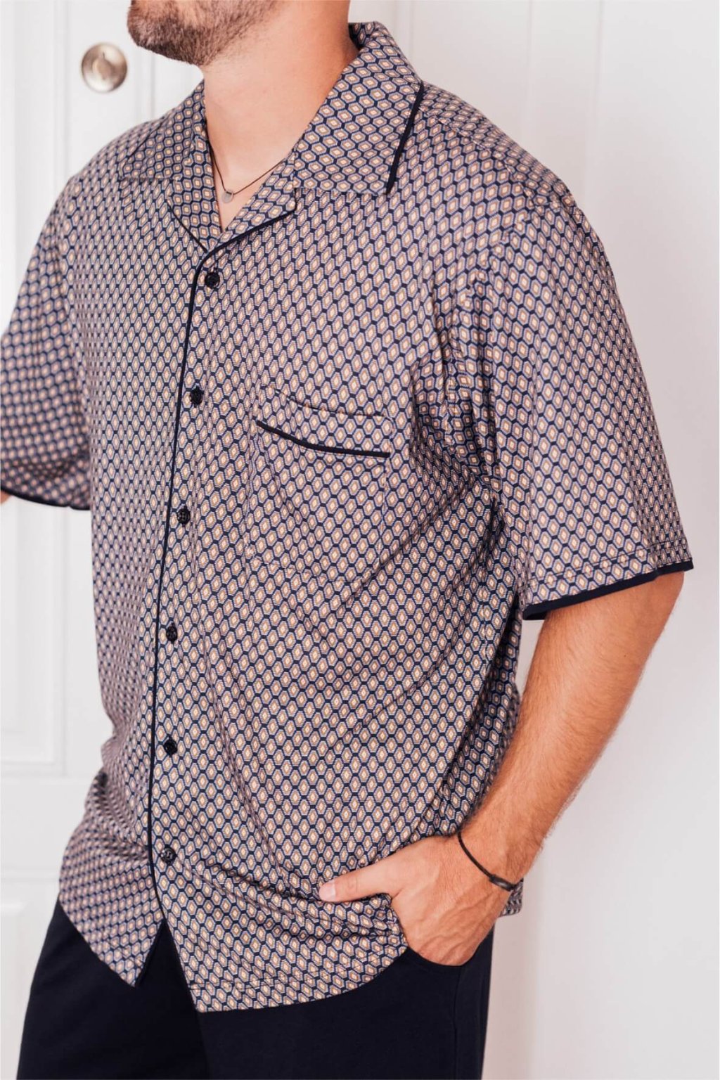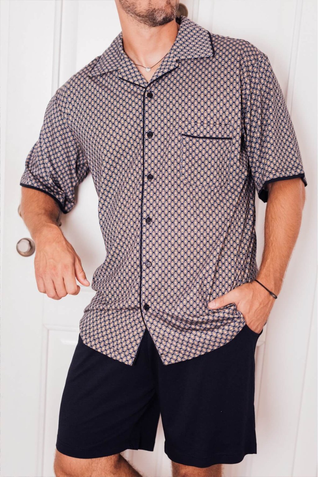 Pánske pyžamo pohodlného voľného strihu. Vrchný diel pyžama má zapínanie na gombíky, vrecko a krátky rukáv.