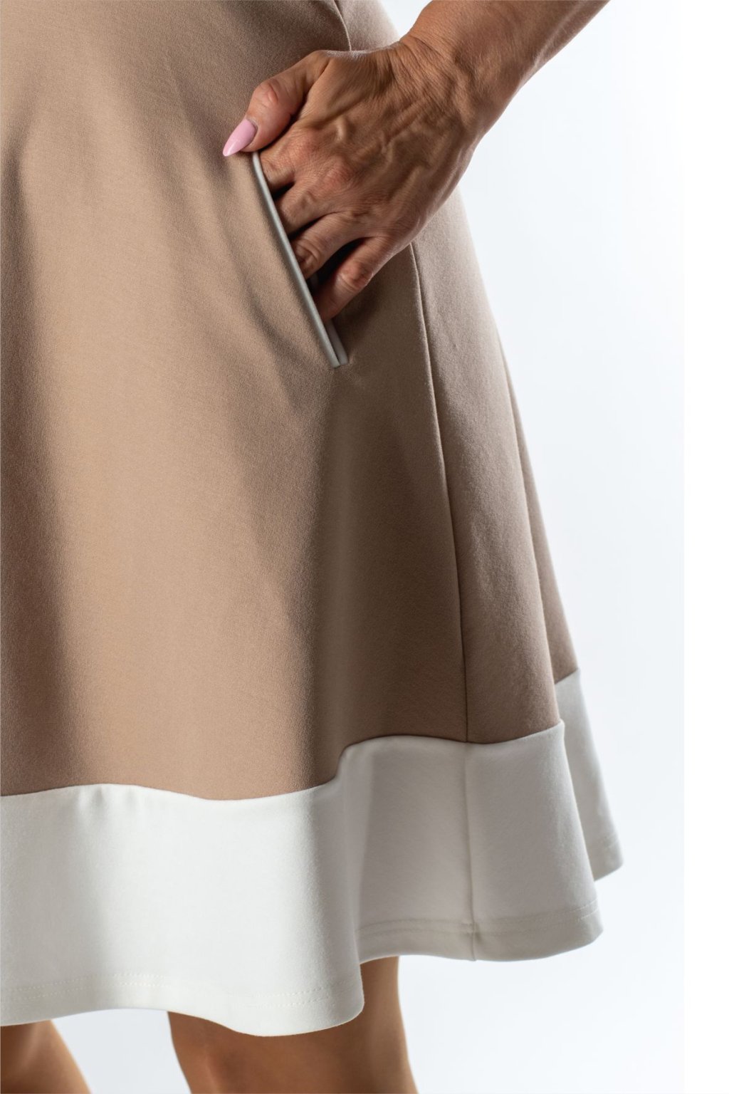 Šaty vďaka farbám pôsobia príjemne a hrejivo. Sú zdobené vreckami s lemom rovnakej farby ako je spodný lem šiat.